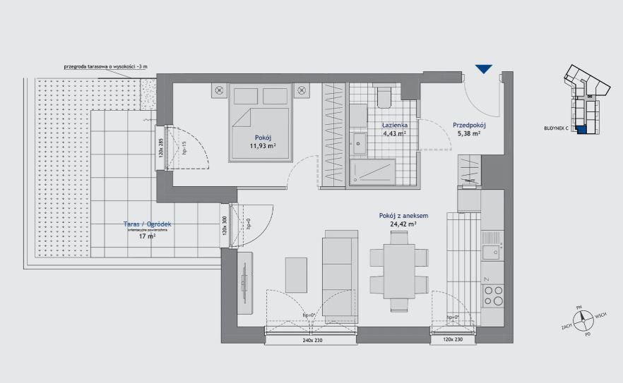 Pokój dzienny z aneksem kuchennym (24,42 m2) i z wyjściem do ogródka (17 m2).