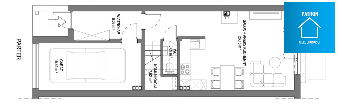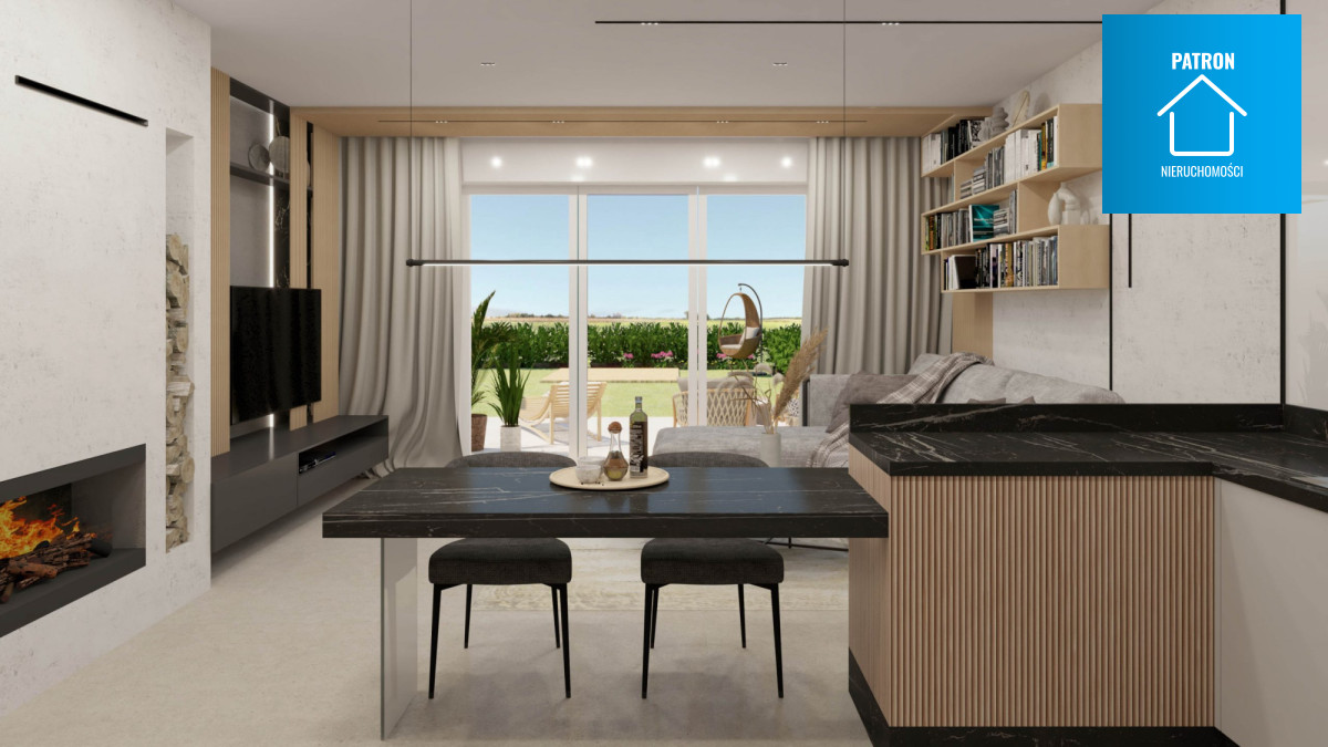 - przestronny salon połączony z aneksem kuchennym (26,15 m2) z wyjściem na ogród