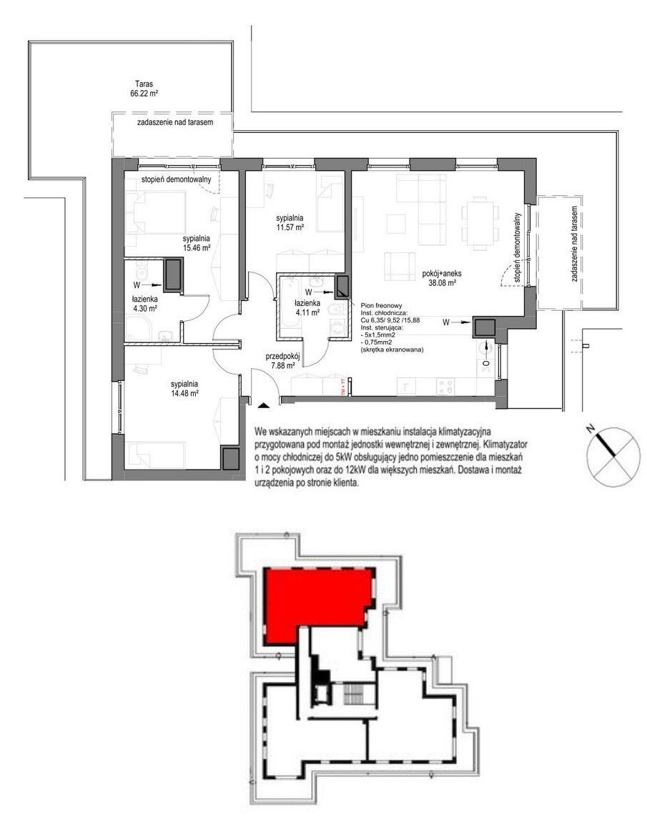 Apartament posiada własny taras o powierzchni 66,22 m2 i ekspozycję wschód- zachód- północ.