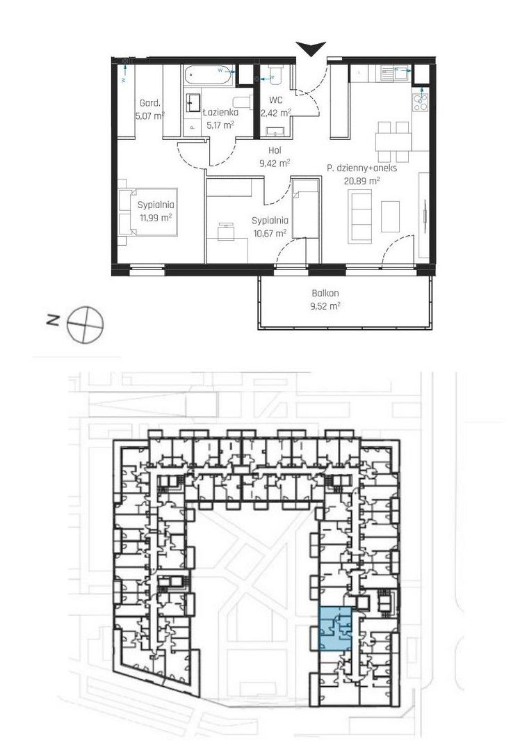 Apartament posiada balkon o powierzchni 9,52 m2, osobną garderobę 5,07 m2 i ekspozycję południowo- zachodnią.