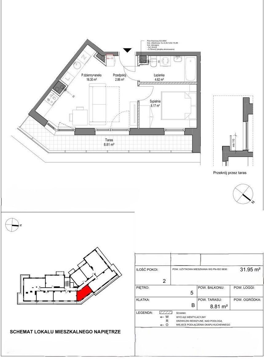 Oferowane 2- pokojowe mieszkanie o powierzchni 31,95 m2 z tarasem (8,81 m2), posiada ekspozycję północno/wschodnią i usytuowane jest na 5- tym piętrze budynku 5- piętrowego z windą.