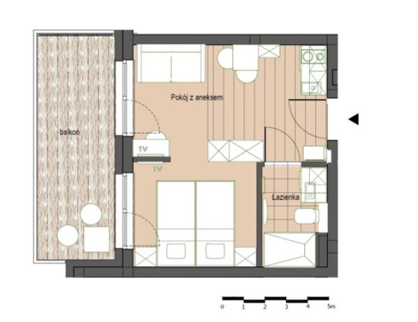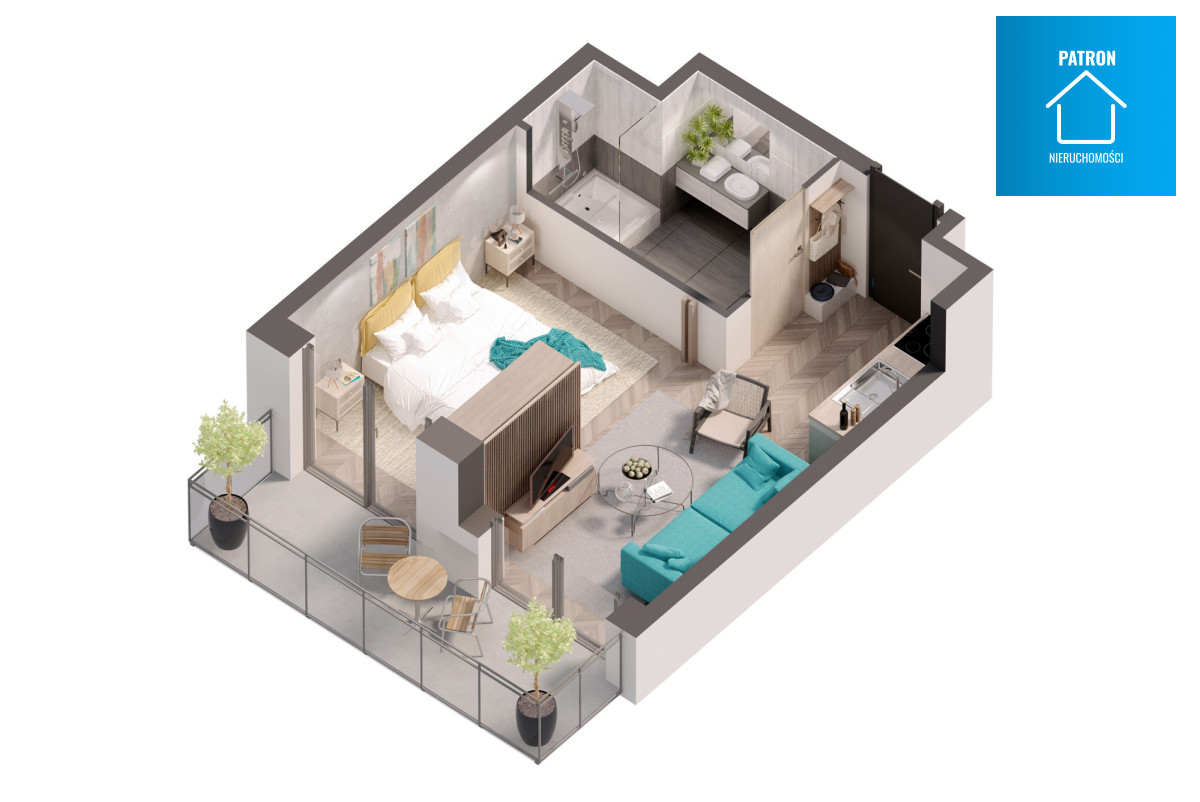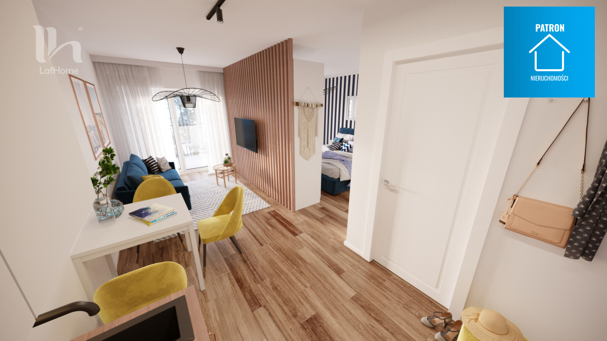 salonu o powierzchni 19,20 m2 gdzie delikatnie wydzielona jest sypialnia, strefa dzienna oraz aneks kuchenny.
